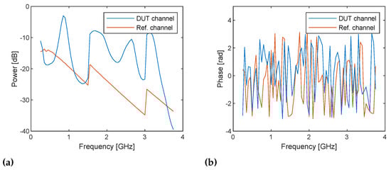 Figure 8 shows the in-phase components of RX baseband signals sampled with the 71 LO frequencies in the DUT and reference channels in the configuration with a 25 cm cable and 20 dB attenuator (Figure 7a). The baseband signals start being received at approximately 1.5 μs in both channels. It can also be observed that baseband signals have a DC offset at some frequencies. The sampled signals are bandpass filtered at the baseband frequency (i.e., 1 MHz) digitally in the host computer to suppress the influence of the image component and DC offset due to the I/Q imbalance of the system, which can be observed in the previous experiment (Figure 5), and to remove noise. I/Q data are obtained by digitally mixing the filtered baseband signals and 1 MHz continuous wave and taking the average from 1/4 to 3/4 of the full-time range (i.e., 1025–3072 samples), which is the steady part. Figure 9 shows the power and phase spectra of the I/Q data with respect to the TX frequency . The power spectra show the frequency responses of the DUT and RF loopback channels, which seem reasonable. Note that the discontinuities at 1.5 and 3 GHz are caused by changing the gains. On the other hand, the phase spectra show random variations because the sampled baseband signals are not phase coherent and contain the initial phases of TX and RX LO signals, which randomly change at each streaming. As shown in Equation (11), the initial phases of LO signals are canceled by dividing the samples of the RX complex baseband signals in the DUT channel by those in the loopback channel. Figure 10 shows the power and phase spectra of I/Q data after the sample division and average. Because the gain adjustment at 1.5 and 3 GHz are different amounts for DUT and RF loopback channels, the power spectrum (Figure 10a) still shows discontinuities, but the frequency response of the PLLs are canceled and become flatter. Initial phase of the TX and RX LO signals are also canceled and the phase spectrum now shows the linear change over frequency.