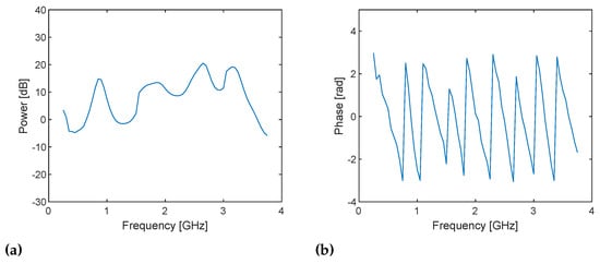 (a) Power and (b) phase spectra of the I/Q data obtained by dividing the baseband signals in the DUT channel by those in the RF loopback channel and taking the average at frequencies from 250 MHz to 3.75 GHz with a step size of 50 MHz for the cable through with 25 cm cable and 20 dB attenuator. Randomly varying phase in Figure 9b become linear. Note that the discontinuities at 1.5 and 3 GHz in the power spectrum are caused by gain adjustment.