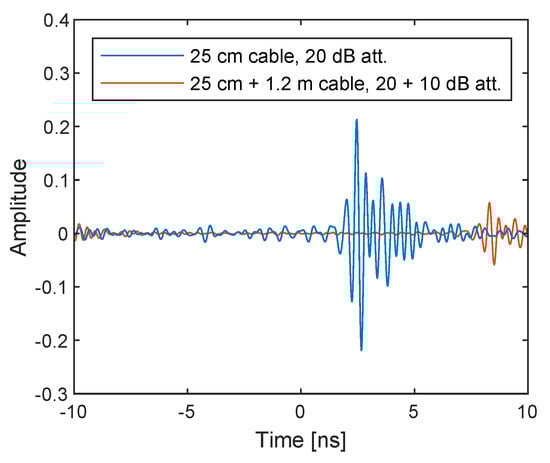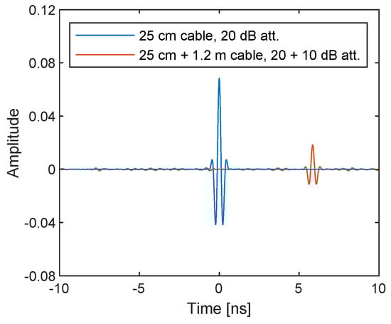 The corrected complex amplitude is inverse Fourier transformed to obtain the time-domain impulse response as shown in Figure 14. The result shows that two sharp pulses appeared at approximately 0 and 6 ns, which corresponds to the time for propagating through the additional 1.2 m cable. The maximum amplitudes in the first and second set-up are, respectively, 0.0684 and 0.0183, of which the ratio is 0.268, and the amplitude difference is thus −11.45 dB. It is slightly more than the amplitude drop expected by including the additional 10 dB attenuator. However, it is a reasonable value considering the attenuation in the additional 1.2 m cable, as can be seen in Figure 13a. The peak amplitudes in the first and second set-up are obtained respectively at 0 and 5.859 ns, which gives a velocity factor of 0.693. The additional 1.219 m cable uses RG-316, whose velocity factor is reportedly 0.695. Therefore, the measurement correctly reflects the time delay of a transmitted pulse, which is crucial for radar applications. From the result that the amplitude and time delay of the pulses are correctly captured, it is verified that the method to compensate for the LO phase using the internal RF loopback works and that low-cost SDRs with only one TX and RX channel can therefore be used to build UWB SFCW radar.
