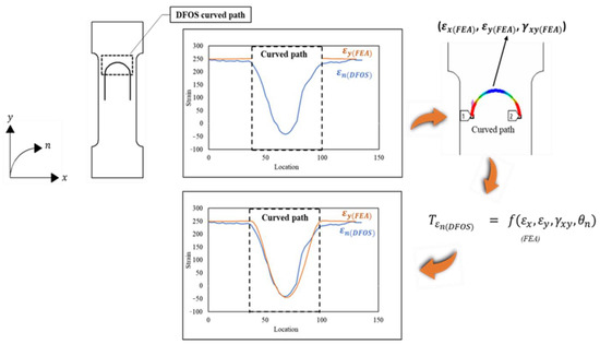 However, there are certain challenges associated with comparing FEA results with DFOS strain measurements. One of the primary challenges is a comparison of FEA results to the strain measurements along the curved path of the DFOS. In all the research studies conducted to date with the DFOS layout arrangement as shown in Figure 1, the DFOS strain measurements along the curved region have been ignored when validating with FEA results or they have been validated with the FSG results. Since the DFOS measures axial strains, comparing the FEA and DFOS strain measurements along a straight path is much simpler as it requires no additional strain transformation, whereas the axis of the DFOS is oriented tangentially along the curvature in a curved fibre path. Therefore, for comparison along a curved section of DFOS, the strain transformation of the FEA results is necessary. This strain transformation has to be undertaken at each location along the curved path of the DFOS using three strain components. To avoid the arduous task of strain transformation at each location along the curved region, the DFOS strain measurements have been validated by comparing them with the FEA strains along a straight path. This approach is effective as long as the DFOS is looped around noncritical areas of a structure. However, if a DFOS is looped around a critical stress concentration area of a structure such as a hole, bolt, or a rivet, it is imperative that the strain measurements are validated for accuracy around the critical stress concentration areas. According to the authors’ knowledge, no strain transformation equation has been presented in the literature, which can be used for simultaneous transformation of the normal and shear strain components at different locations along a semicircular curved path into a strain component measured by the DFOS along the curved path at the locations where normal and shear strain components have been obtained.