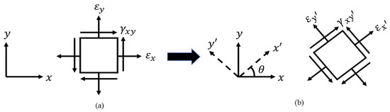 The strain transformation equation presented in this paper is based on a 2D plane strain theory of elasticity. In a 3D strain state, a solid element has three normal and three shear strain components. In contrast, in a 2D plane strain condition, the strain normal to the plane (), and the shear strain () and () are assumed to be zero. The non-zero normal strain components and , and shear strain component on a 2D solid element in coordinate system are shown in Figure 3. In the rotated 2D solid element shown in Figure 3, the axes and are oriented at certain angle θ with the coordinate system. The strain transformation from the coordinate system to can be achieved using the general 2D plane strain transformation in Equation (1).
