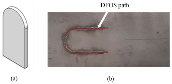 Preparation of specimen: (a) Guide used for mounting the DFOS; (b) DFOS path on the surface of the specimen.