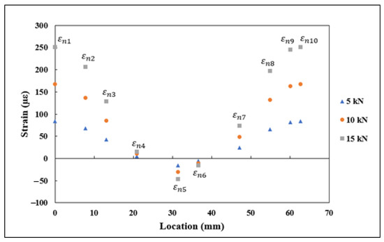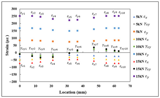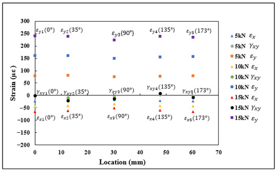 Each 0°/45°/90° stacked SR provided three strain measurements, namely , , and , aligned along the axis, as shown in Figure 13. These strain measurements were substituted into rosette transformation (Equation (5)) for obtaining the normal and shear strain components , , and . The strain measurements , , and obtained from the five rosettes under the application of 5, 10, and 15 kN tensile load are shown in Figure 14. A similar procedure to the one used with the FEA results was used with the strains measured using rosettes for . The transformed strain values derived from the rosette measurements are presented in Figure 15. The strain measurements, which are shown in Figure 14 and Figure 15, had a close correlation both qualitatively and quantitively to the strains shown in Figure 9 and Figure 10, which are obtained numerically under the tensile loading scenario.