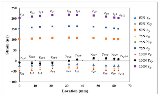 On the specimen loaded under flexure, the DFOS was on the tensile surface. To be consistent with the experimental measurements, in FEA, the , , and values were extracted on a similar surface which had undergone tension due to applied load. The normal and shear strains , , and from FEA under 50, 75, and 100 N flexural load are shown in Figure 11. The strains shown in Figure 11 for flexural loading followed a similar trend to the strains obtained under tensile loading. The vertical strain components were under tension, while the horizontal strain components were under compression, and the shear strain components transitioned from compression to tension from the start to the end of the curve. The normal and shear strain components and the , shown in Table 2, were substituted into the Equation (4) for finding the transformed strain values . The derived strain values using the proposed strain transformation equation are shown in Figure 12. The strains shown in Figure 12 also followed a similar trend to the values derived under tensile loading, which are shown in Figure 10, transitioning from tension to compression and to tension from start to the end of the curve.