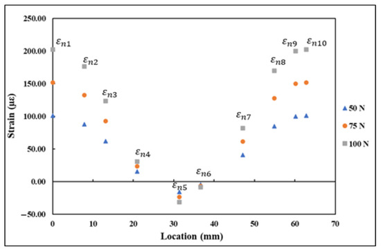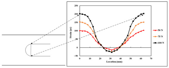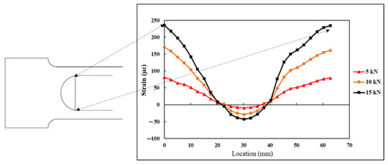 The DFOS was adhesively bonded on the specimen surface in a semicircular form, with a radius of curvature mm and an arc length of 62.83 mm. The DFOS measured the strains at 2.6 mm intervals along its length. The strain values , measured by the DFOS along its length under 5, 10, and 15 kN tensile load, are shown in Figure 16. The start and end of the curve are also highlighted in Figure 16. From the plot, it can be seen that at the start of the curve, the strains on the specimen are maximum and tensile, and at the centre of the curve, the specimen strains are at maximum compression.