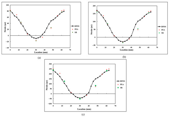 The strain values derived by the FEA and rosettes (denoted by SR) were compared with the DFOS strain measurements for validation. A comparison of the strain measurements under tensile load is presented in Figure 18. In the plot shown in Figure 18, it can be observed from the plot that the strain increased linearly with an increase in applied load. Furthermore, the strains were within the elastic strain limit of the steel. The values derived from the FEA and strain rosettes are in close agreement with each other. The FEA and strain rosettes results are also in close agreement with the DFOS results. However, at the location , at an arc length of 47.1 mm, significant deviation can be observed in the values measured by the DFOS.
