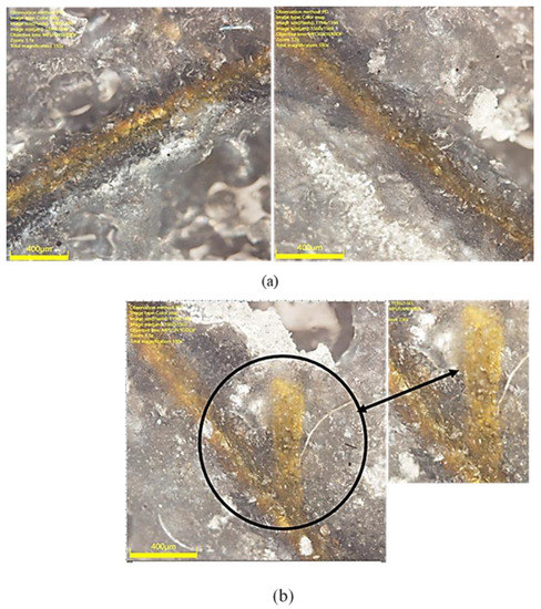 Initially, it was theorized that the large difference in strain values could be due to the localised imperfect bonding of the DFOS on the surface of the specimen. To identify the flaws in the sensor bonding, the DFOS was examined under optical microscopy. A commercial Digital Olympus DSX510 microscope with 13.5X optical zoom and 30X with digital zoom was used for microscopic examination of the DFOS coating. Microscopic examination showed that while there was no flaw in the DFOS bonding, the DFOS polyimide coating was damaged at the location where the sensor measured high strain reading. The intact DFOS coating at two different locations on the fibre is shown in Figure 19a, and the damaged DFOS coating is displayed in Figure 19b. The damage to the DFOS coating may have occurred during the sensor installation process and may have contributed to the high localised strain readings. A comparison of the strain difference between the coated and uncoated fibre for the same applied stress was carried out by Okabe et al. [35], through calculations and experiments. The results from this study showed that an uncoated fibre measures high strains than a coated fibre, which provided a smoothened strain distribution. The influence of different DFOS coatings on the strain measurements has been further highlighted in the previous research studies conducted by Weisbrich and Holschemacher [36] and Oliveira et al. [37]. At the remaining locations, the values obtained through FEA, strain rosettes, and DFOS correlated with each other. The strong correlation of the DFOS readings, strain rosettes readings, and FEA results at locations of approximately 10 mm away from the damaged location indicates that the DFOS can continue to function with integrity with a point of localised damage.