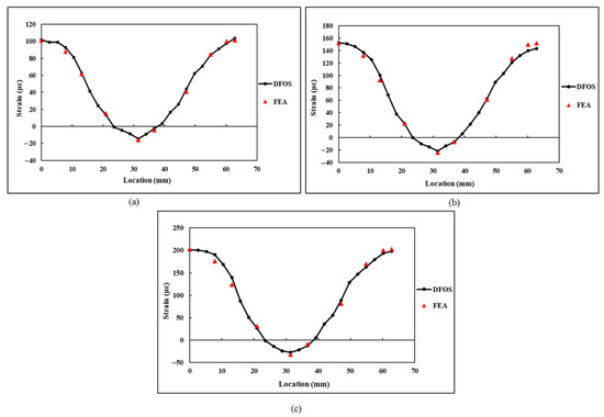 A comparison of the derived strain values using the strain transformation equation and measured strain values using the DFOS under flexural loading is presented in Figure 20. Since no strain rosettes were used during the flexural testing, the derived values were only compared with the measurements of the DFOS. From the results, a close correlation between the derived strain values and measured strain values can be observed. Furthermore, the difference between the strain values for flexural loading is less than that of the tensile load. During the flexural testing, good adhesion and an intact sensor resulted in the reduction in deviation between the DFOS and FEA strain values.