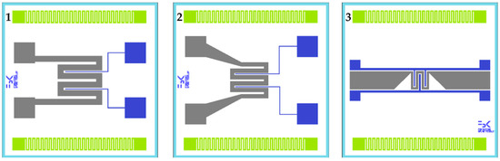 The three different layouts produced and tested in this work, named layouts 1, 2 and 3. In all the layouts, the heaters are represented by grey serpentines, while the electrodes by blue lines. Two reference resistances, depicted by green serpentines, were added in the devices for an extra evaluation of the temperature coefficient of resistance.