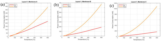 The value of KEAD of Figure 6 is calculated in the range 200–600 °C from the values of A% of layouts 2 and 3 reported in Table 3. Thereby, the theoretical power consumption of layouts 2 and 3 on membranes A, B and C are calculated and compared to the experimental measurements, as shown in Figure 7. As plotted in Figure 7, the predictive model with the constant KEAD fits almost perfectly the experimental curves: this indicates that the model allows for the prediction of the power consumption of an MH during the design phase, achieving one of the purposes of this work. Clearly, the smaller the MH and the A% occupied, the lower the power consumption will be. Nevertheless, the results show that the membrane size significantly affects the power consumption only for A% higher than 50%. In conclusion, the results underline that the optimal A% of a MH is around 50%, since a lower A% does not significantly reduce the power consumption but negatively impacts the toughness of the membrane (Section 4.2).