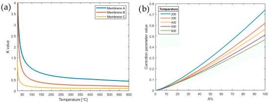 where Qmem, Qtop and Qbot were already explained in detail in Section 2.2. Figure 6a reports the value of the KEAD calculated in Equation (8) as a function of the temperature and the membrane dimensions. It is clear that the value of KEAD is strongly affected by the temperature and by the A%. The plot shows an asymptotic value at a high temperature depending on the A%: the higher the A%, the higher the asymptotic value of KEAD.