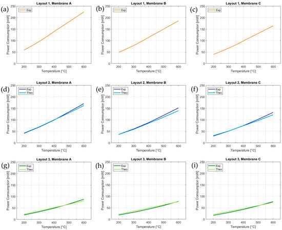From (a–c) the experimental power consumption of layout 1 on membranes A–C, from (d–f) the comparison between the theoretical and experimental power consumptions of layout 2 on membranes A–C and from (g–i) the comparison between the theoretical and experimental power consumptions of layout 3 on membranes A–C.
