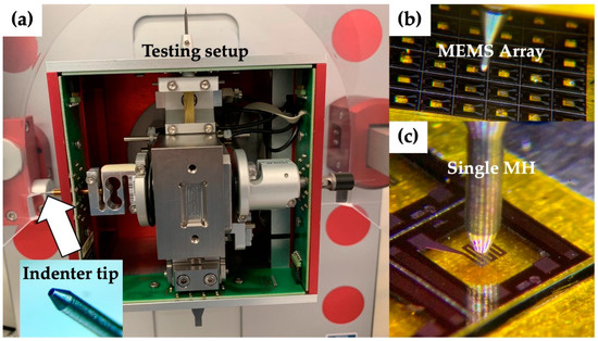 (a) Shear-pull tester adapted setup for axisymmetric indentation tests. (b) The modified setup can be used for high-throughput testing of the micro-electro-mechanical system (MEMS) array. (c) Indenter tip aligned for testing the MEMS MH (layout 1, membrane C).