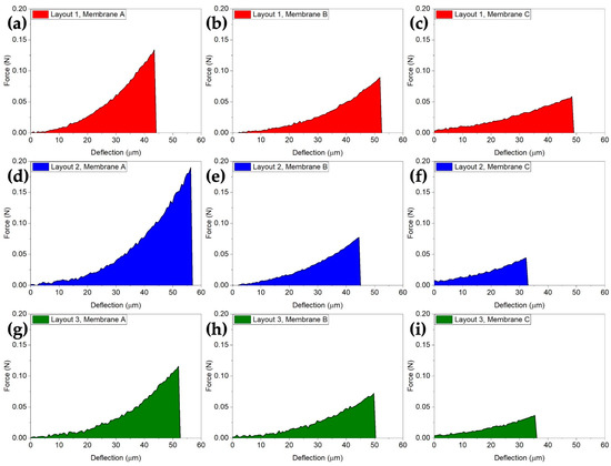 Average force–deflection curves from the destructive indentation testing. The shaded areas represent the work of the fractures. (a–c) Layout 1, (d–f) layout 2 and (g–i) layout 3. In each row, smaller-to-larger MH membranes are shown from left to right.