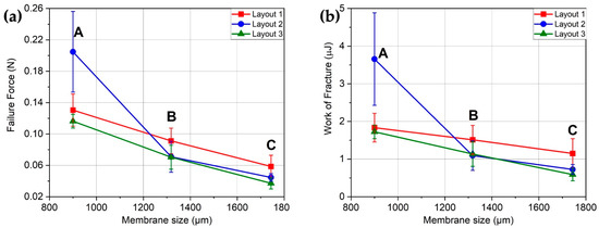 The force–deflection curves of Figure 9 are correlated with the mechanical stability and resistance of MH throughout the sensor fabrication process. For instance, the failure force (see Figure 10a) gives a useful reference for the maximum force that MH can withstand. A similar indication (see Figure 10b) can be found in the work to fracture required to break the MH having dimensions in the range of µJ. Comparing different layout and sizes, we report a five ÷ six-fold difference between the strongest and toughest layout (2A), with 205 mN of failure force and 3.66 µJ of work to fracture, and the least-resistant layout (3C) that showed 37 mN and 0.59 µJ. The overall trend of the three membrane layouts was downward in both the failure force and work to fracture by increasing the membrane size from A to B and C. For all three layouts, the small membranes were the strongest. This is expected behavior due to the defect–size effect that makes smaller membranes (A) more resistant.