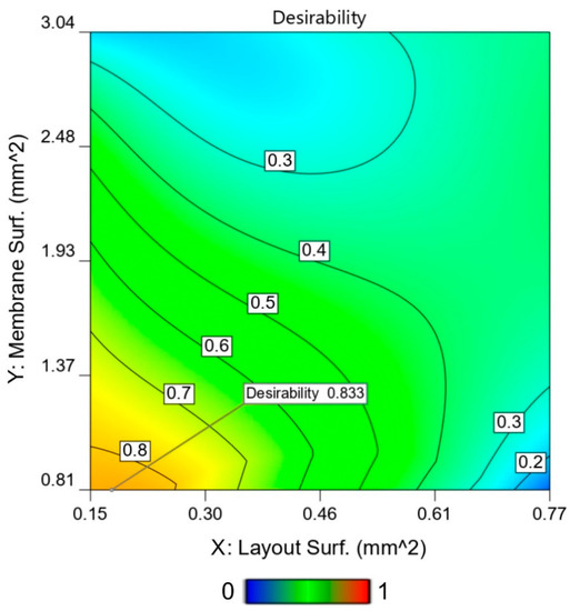 We notice that the membrane size C shows an estimated percentage of broken membranes that is too high to be acceptable for production. Indeed, the desirability of the three sets of the C membrane is the lowest (see Figure 11) and is not advised as the support structure for chemoresistive gas sensing. Therefore, for design purposes, only A and B sizes should be considered. Both sets show a very high production yield, with a maximum percentage of about 2% of broken MHs. Regarding the mechanical stability, both A and B membrane sizes can be used in the MH for gas sensor development.