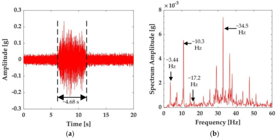 The time-history responses of the train-induced vibration acceleration shown in Figure 3a were converted to the amplitude spectra with a Fourier transformation to analyze the frequency–domain characteristics of the vibrations, as shown in Figure 4b. It can be observed from the figure that:
