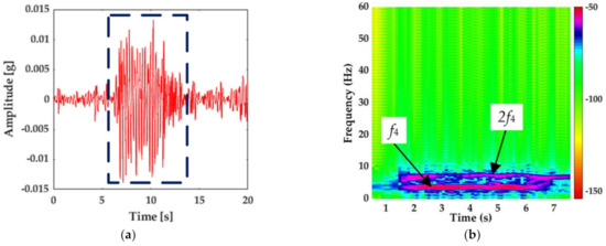 Reconstruction of vibration signal of characteristic frequency bands by the wavelet packet. (a) The time-history signal. (b) The time-frequency diagram.