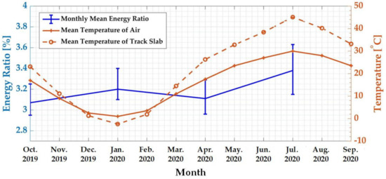 The relationship between the monthly average WPE of the characteristic frequency band and the monthly mean temperature was analyzed. The results are shown in Figure 6. It can be observed that the air temperature changes of the experimental station and the surface temperature of the track slab in one year were periodic, with the lowest values in January and the highest values in July. Taking the most typical months of winter, spring, summer, and autumn as examples, which were January, April, July, and October, respectively, the monthly mean WPE of the characteristic frequency band was expressed as an error curve. Figure 6 shows that the WPE values in summer and winter were higher than those in spring and autumn, reaching 3.38% and 3.20%, respectively.