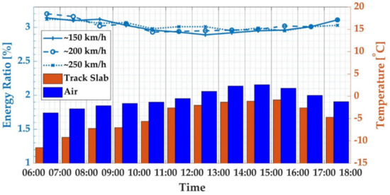 We then analyzed the relationship between the WPE of the characteristic frequency band and the temperature in a day in summer. Figure 7 shows the WPE of the characteristic frequency band of the track slab vibration response caused by trains with three different speeds during the operation period of the high-speed railway on 30 July 2020. During testing, the surface temperature of the track slab changed synchronously with the air temperature, and both reached their peak values at 14:00–5:00. Due to the poor heat transfer performance of the concrete, the temperature difference between the upper surface and the lower surface of the track slab also reached the peak value during this period. At that time, the deformation of the track plate also reached the maximum value [10,11]. It can be seen from Figure 6 that the characteristic frequency-band energy ratio increased with the increase of the difference between the air temperature and the surface temperature of the track slab, and the characteristic frequency-band energy ratio reached the peak value in the period of 14:00–15:00.