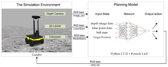 In recent years, with the rapid development of artificial intelligence and deep reinforcement learning (DRL) technology, learning-based path planning, obstacle detection, trafficability analysis and other technologies have been widely concerned by researchers [13,14,15]. DRL has the advantages of not requiring environmental maps, strong learning capabilities, and high dynamic adaptability. Its deep network can successfully process high-dimensional information from sensors, and its reinforcement learning mechanism can perform continuous decision-making tasks in complex environments [16,17,18]. The successfully trained network model can directly generate optimal control commands for the lunar rover based on sensor information, omitting the complex environment reconstruction and sensing steps of traditional algorithms, and is very suitable for dynamic planning tasks such as lunar exploration with the unknown environment and limited on-board computing resources. However, most of the current DRL algorithms are developed based on simple environment training such as gym, which are far from being applied in real environments.
