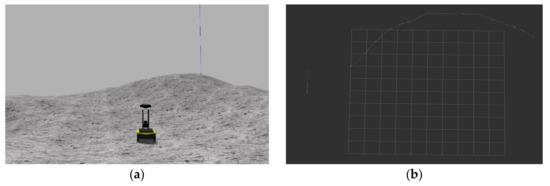 In this paper, the lunar surface simulation environment is established by using Gazebo in the robot operating system (ROS), which is combined with the physical open dynamic engine (ODE) for 3D simulation [25,26]. Similar to the game engine which provides high fidelity visual simulation, Gazebo provides high fidelity physical simulation, which provides a complete set of sensor models and a very user-friendly interaction mode. To generate a more realistic topography of the lunar surface, this paper first downloads the CE2TMap2015 lunar DEM dataset formed by the Chinese Chang’e-2 photography [27], and scales down its elevation data to generate a simulated topography. Select the area with representative features of the terrain near the moon’s equator as the simulation scene. The DEM elevation information of this area is shown in Figure 2a. It can be seen that there are typical lunar features such as large/small craters, mountains, and moon valleys in this area. Load the scaled DEM data of this area as a terrain model into the .world file in Gazebo and perform realistic visual renderings of lunar environments, then we can generate a lunar rover simulation training environment as shown in Figure 2b.