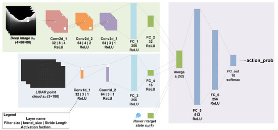 We use CNN to extract environmental features from sensor information, and then use deep neural networks to perform nonlinear approximation of RL value and policy functions to realize the path planning of the lunar rover. The network structure is shown in Figure 5. The network input is the state defined in Section 4.1, and the output is the selection probability of action value defined in Section 4.2.