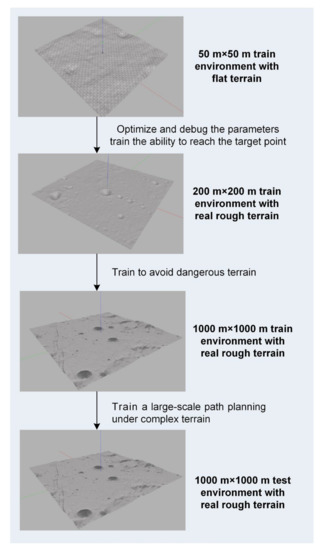 In addition, in order to improve the adaptability of the planner to different terrains and different scales of movement planning on the lunar surface, this article adopts the idea of curriculum learning and uses different terrain features and different sizes of lunar environment training planning networks [30]. The curriculum learning process is shown in Figure 6. First, train on a small area with a very flat terrain, optimize and debug the algorithm parameters and train the ability to reach the target point in a simple scenario. Then gradually increase the scope of the planning scene and the complexity of the terrain in the scene, and gradually increase the safety reward factor, so that it will gradually learn a large-scale path planning under complex terrain and realize more intelligent autonomous navigation.