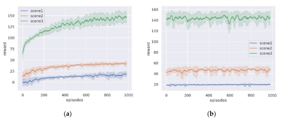 The average reward curve in the three simulation scenarios. (a) Training process; (b) Evaluation process.