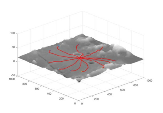 For the local path planning of lunar rover, Xing et al. [20] proposed a local comprehensive obstacle avoidance planning method based on quantitative evaluation of terrain accessibility and target accessibility, which can achieve local obstacle avoidance and ensure target accessibility. It has been successfully applied to the autonomous navigation of China’s “Yutu” and “Yutu-2” lunar rovers. Masahiro et al. [21] proposed a terrain classification and path planning algorithm that can predict terrain risks, including a machine learning-based terrain classification capable of identifying potential hazards from images, and a risk-aware path planner based on the Rapid Exploration Random Graph (RRG) and A* search algorithms, which can avoid hazards identified by the terrain classifier and explicitly consider the vehicle dynamics constraints. Reiya et al. [10] proposed an RRT* algorithm based on traversability analysis in rough terrain. First, the point cloud data is captured by the LIDAR sensor to form an environmental map, and then the RRT* algorithm is used to sample directly from the LIDAR point cloud data, and the rough terrain accessibility of lunar rover was considered in the process of RRT* tree expansion. Local path planning algorithm needs complex 3D reconstruction and environment perception in advance, which seriously limits the speed of lunar rover. Therefore, it is urgent to develop more intelligent and efficient technology.