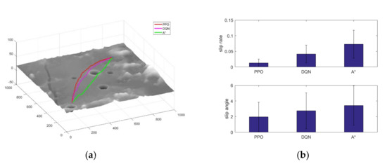 Figure 9a shows the paths planned by the three algorithms, where the path generated by the A* algorithm leads directly to the target point, avoiding obstacle areas on the way that exceed the capability limit of the lunar rover. While the trajectories generated by the PPO and DQN algorithms can be relatively far away from the danger areas. Figure 9b shows the changes of slip rate and slip angle of the paths generated by the three algorithms, and it can be seen that the paths planned by the algorithm proposed in this paper have obvious advantages in terms of slip rate and slip angle control, which can improve the safety of the lunar rover autonomous exploration process.