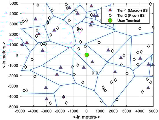 In each round of simulation with new input attributes, two-tier cellular networks (K = 2) were simulated, comprising macro-cells and pico-cells, where the BSs of each tier were massive-MIMO enabled. The threshold (Th) of the SINR value in the CP calculation was taken as 10dB. To capture the stochastic nature of the network topology, for each network configuration, the network was simulated 200 times and the results were averaged out. Each time, the cellular network was deployed on a torus of (10 × 10) km2. To capture the worst-case scenario, the spatial locations of the BSs stations were modeled using two independent PPPs, with the node densities of two layers related as . The topology of a typical tow-tier simulated network where the spatial locations of BSs are modeled with two independent PPPs is shown in Figure 2.