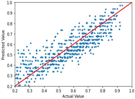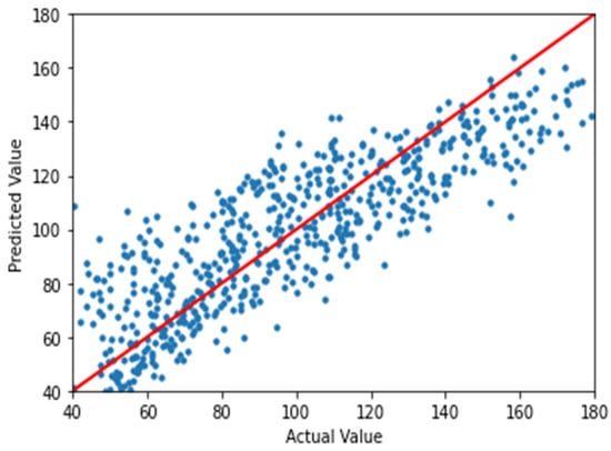 To visually inspect the performance of the regression process, the actual values vs. predicted values of the finalized model were plotted. Figure 3 and Figure 4 show the actual values vs. values predicted by the finalized model for ASE and CP, respectively, where it could be seen that the model fits linearly with the trend line. The performance of the finalized models has been quantitatively evaluated based on the residue over the predicted output of the dataset, and the results are given in Table 6.