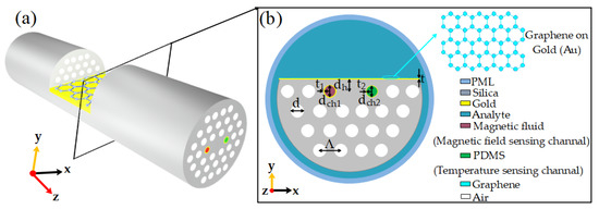 Compared with traditional optical fiber, photonic crystal fiber (PCF) has attracted more and more researchers’ attention due to its high birefringence, low loss, high nonlinearity, and flexible structure. Photonic crystal fiber (PCF) introduces a stomatal filling structure into the cladding. It fills the pores with different sensitive materials to show photonic crystal fiber sensors’ other sensing characteristics in different environments [1,2,3]. Surface plasmon resonance (SPR) is a physical phenomenon occurring on dielectric and metal surfaces [4,5,6].When the evanescent wave generated by the total internal reflection of incident light appears at the interface of the metal medium and the surface plasmonic wave meeting the phase-matching condition, resonance will occur, resulting in a large amount of incident light energy being coupled to the surface plasmon wave, the incident light energy will sharply decrease, and show a loss resonance peak in the loss spectrum. Because SPR can effectively detect small changes in the refractive index of the surrounding environment, in 1968, Otto combined a prism with a metal film to design the first SPR sensor structure [7], which attracted much attention because of its high sensitivity. However, the design of the Otto structure increases the complexity of the overall system of the sensor. Therefore, in 1971, Kretschmann improved the Otto structure [8] and significantly reduced the structural complexity. However, the prism-based SPR sensor needs complex optical and mechanical components, which leads to its large volume and is not suitable for remote sensing [9]. In 2006, Hassani et al. first combined SPR sensing with PCF and designed a surface plasmon resonance sensor based on photonic crystal fiber [10]. This sensor has a flexible structure, easy phase matching, good single-mode characteristics, and high sensitivity. However, in this structure, both the liquid channel and the metal film are placed in the cladding air hole of the photonic crystal fiber, which requires a high process and is difficult to make. Therefore, in 2012, Ming Tian et al. proposed a model of outer cladding coating based on D-type PCF [11], which placed the liquid and metal film outside the cladding, thus significantly reducing the process difficulty and practical operation complexity. Still, this structure is coated with metallic silver on the side polishing plane, and silver is easy to oxidize, resulting in reduced sensor accuracy. Graphene coatings have a broad prospect in sensor application because of its high surface volume ratio, high electron mobility, and strong absorption. In 2014, Dash J. N. proposed a PCF–SPR sensor coated with graphene on silver film [12]. When graphene is coated on the surface of the silver film, it can not only prevent the silver film from being oxidized, but also improve the sensitivity of the sensor [13].