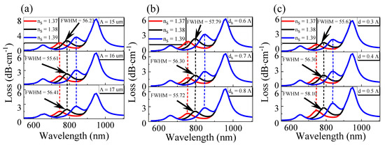 The variation of transmission loss with a wavelength and different refractive index of liquid to be measured: (a) with different air hole spacing Λ; (b) with various side’s depth dh; (c) with different air hole diameters d.
