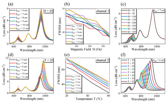 Next, we continued to optimize the diameter of channel 1 and channel 2 of the sensor, and the simulation results are shown in Figure 3. From Figure 3a,d, we can see that when the diameter dch1 and dch2 increase, the loss of channel 1 and channel 2 increase gradually but have little effect on the RI. This is because when the diameter of channel 1 or channel 2 become larger, the defect hole diameter increases, making the distribution of the refractive index of the fiber more asymmetric and the birefringence of PCF stronger. It will also weaken the energy constraint ability of the fiber core in the x-axis direction, and more x-direction means more fundamental mode energy, which is coupled to channel 1 and channel 2, which increases the loss of channel 1 and channel 2. Simultaneously, the increase in channel 1 or channel 2 will improve the magnetic fluid content, and PDMS filled in channel 1 and channel 2 coupled more core energy to the channels on both sides. However, because the refractive index of MF is much smaller than that of the core, the energy coupled to channel 1 will be less than that of channel 2. At the same time, we can also find that the size changes of channel 1 and channel 2 do not affect the RI, which indicates that the size changes of the two channels have no effect on the base mode energy in the y-direction; when the diameter of the two channels increases, the metal film coated on the two channels will not only increase the contact area but also reduce the sensing distance from the fiber core diameter. However, the refractive index of MF is much smaller than that of the fiber core, so the shift of the resonant wavelength is not apparent, and the resonant wavelength is unchanged. However, the effect of channel 2 is more prominent. As shown in Figure 3d, the resonance wavelength will find a redshift, but under different diameters, the shifting trend of the resonance wavelength is the same; it has no effect on the sensor’s sensitivity. Additionally, from Figure 3b, it can be found that the increase in channel 1 size will make the FWHM decrease at first and then increase; Figure 3e shows that with the rise of channel 2 diameter, the FWHM will increase. When the magnetic field intensity changes, we can find from Figure 3c that the resonant wavelength of channel 1 changes, while RI and channel 2 are not affected. However, when the temperature changes, although channel 1 is mainly responsible for magnetic field detection because its filled magnetic fluid also has a temperature sensitivity coefficient, it will also have an impact on channel 1, as shown in Figure 3f. Similarly, temperature changes do not affect RI. This can reflect the multi-parameter integrated detection sensor we designed. There is no cross-influence among the parameters. Because dch1 and dch2 do not affect the sensor’s sensitivity, the sensor proposed in this paper has a good fabrication tolerance.