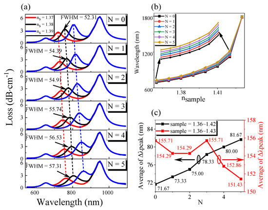 Then, we used the transition boundary conditions to optimize the number of graphene layers while keeping other parameters unchanged. Finally, we used OriginPro software to process the data, and the results are shown in Figure 4. As shown in Figure 4a,b, in the same external environment, with the increase in graphene thickness, the resonance wavelength increases, the loss decreases, and the resonance curve widens, and FWHM increases. This is mainly because the effective refractive index of the metal interface increases with the increase in graphene thickness, so a higher resonance wavelength is needed to meet the resonance condition. At this time, the damping loss of graphene increases. Therefore, when SPR occurs, the core mode’s energy coupled to the SPP film is reduced, resulting in a reduced loss. From Figure 4c, we can see that when the refractive index of the external environment is in the range of 1.36 to 1.42, the average resonance wavelength shift increases with the increase in graphene thickness, so the average sensitivity of the sensor increases. When the refractive index of the external environment is in the range of 1.36 to 1.43, the average resonant wavelength shift fluctuates slightly with the rise of graphene thickness, reaches the maximum at N = 3, and then decreases gradually. This is because graphene is a kind of lossy medium with real and imaginary parts. When the number of layers of graphene (N) increases, the imaginary part of graphene also increases exponentially, which increases the carrier concentration and leads to the increase in the chemical potential (µc) of graphene, and the corresponding resonance wavelength is red-shifted [27]. After a comprehensive analysis, we chose the layer number of graphene N = 3.