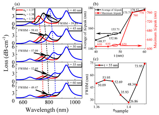 We simulated the gold film thickness of the side polishing plane, channel 1, and channel 2. Firstly, the structure of the gold film thickness t coated on the side polishing plane was optimized, and the result is shown in Figure 5. As can be seen from Figure 5a, when the thickness t of the gold film becomes more extensive, the loss of the sensor decreases gradually, the resonance wavelength is red-shifted, and the FWHM decreases slowly. This is mainly because the thicker the gold film is, the more the energy of evanescent wave attenuates and less energy is coupled with the SPW mode, so the loss becomes smaller. When the thickness of the gold film increases, the effective refractive index of SPW increases, but the core remains unchanged, which the phase matching point of SPW mode and the core fundamental mode redshifts when SPR occurs, that is, the resonance wavelength redshifts. In this case, FWHM decreases with the increase in the gold film thickness because when the gold film is relatively thin, the evanescent field’s energy focused on the film is very weak, and the excitation effect of SPR is not good, thus making the FWHM larger. Besides, it can be found that when the thickness of the gold film changes or when the refractive index changes, channel 1 and channel 2 will not change, indicating that the RI channel will not have cross-effects with the other two channels.