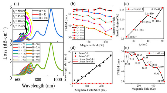 When the magnetic field intensity varies at 20~550 Oe, Figure 6d shows that the resonant wavelength shift increases with the magnetic field intensity offset. At this time, through the linear fitting of OriginPro software, we can obtain Δλ1H = 0.15631ΔH − 4.89956, the sensitivity of magnetic field intensity was 156.31 pm/Oe, and the degree of linearity was 0.99027; the wavelength resolution of the sensor was assumed to be Δλmin = 0.1 nm, and the magnetic field resolution was 0.64 Oe [29]. Channel 2 was not affected by the change of magnetic field intensity. As shown in Figure 6e, when t1 = 40 nm, the FWHM of channel 1 decreased with the increase in magnetic field intensity, and the minimum can reach 34.97 nm. In this case, according to Equation (6), FOM = 4.47 × 10−3 Oe−1.