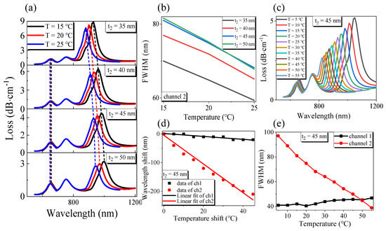 The temperature T is changed sequentially from 5 °C to 55 °C, with a step size of 5 °C for t2 = 45 nm. By observing Figure 7c, it can be found that both channel 1 and channel 2 have a blue shift in resonance wavelength and a gradual decrease in the loss with the increase in temperature. This is because both MF and PDMS of channel 1 and channel 2 have negative temperature coefficients. Figure 7d shows that the resonant wavelength offset of the two channels decreases with the increase in the temperature shift; after the linear fitting of OriginPro software, the linear fitting expression of channel 1 could be obtained as Δλ1T = −0.50909ΔT + 1.45455, the temperature sensitivity was −509.09 pm/°C, the degree of linearity was 0.95455, the linear fitting expression of channel 2 was Δλ2T = −5.00131ΔT − 4.73636, the temperature sensitivity was 5001.31 pm/°C, and the degree of linearity was 0.99275. The wavelength resolution of the sensor was assumed to be Δλmin = 0.1 nm, and the temperature resolutions of channel 1 and channel 2 were 0.196 °C and 0.02 °C, respectively. From Figure 7e, when t2 = 45 nm, the FWHM of channel 1 increased with the increase in temperature, the minimum FWHM was 40.43 nm, and the FWHM of channel 2 decreased with the rise of temperature, and the minimum could reach 38.84 nm. According to Equation (6), the FOM of channel 1 and channel 2 are −1.26 × 10−2 °C−1 and −0.129 °C−1, respectively.