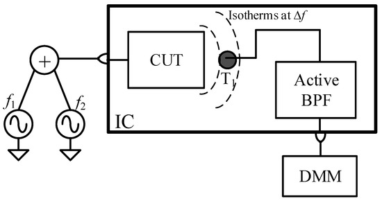 These limitations have motivated the design of a novel circuit topology that we presented in [42] (Figure 1). One sensing device (T1 placed near the CUT) is connected to an active band-pass filter (BPF). The filter’s band-pass is centered at Δf so that the bandwidth (and hence the noise) is limited around the frequency of interest. The BPF’s zero at the origin rejects slow temperature variations (provoked by either ambient temperature changes or the DC CUT power dissipation). To achieve a CUT thermal signature within the frequency band of the sensor, we propose to excite the CUT with a heterodyne technique [41,43]. The technique consists of applying two tones, whose frequencies are f1 and f2 = f1 + Δf, to the CUT input. This driving strategy generates a spectral component of power dissipated by the CUT devices (and hence of temperature) at Δf, whose magnitude depends on the CUT figures of merit at f1. For Δf values higher than a certain threshold (fixed by both the die thickness and semiconductor thermal properties [40]), the amplitude of this temperature component is no longer dependent on the package materials and package mounting thermal properties, i.e., the silicon die is seen by the CUT, from a thermal point of view, as a semi-infinite medium, independent of the thermal boundary conditions (including ambient temperature). This heterodyne technique is not new: it has been already used with differential temperature sensors connecting the sensor’s output node to a lock-in amplifier (LIA) locked at Δf [33,35]. To reduce costs, the BPF output signal is proposed to be measured using a low-cost digital multimeter (DMM), off-chip in this work, but that allows an easier integration than the LIA if a complete built-in test approach is required.