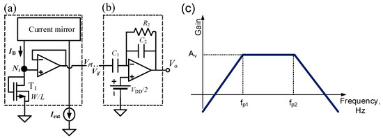 Since the OA gain-bandwidth (GBW) product is 2.4 MHz, this results in a theoretical value for fp2 of 4.8 kHz. To have a low fp1, resistor values in the order of GΩ are required, thus R2 was implemented with two subthreshold biased pMOS, as shown in Figure 3 [46,47,48,49]. These MOS had W = 2 μm and L = 10 μm, and the external voltage VBIAS applied to their gate allows tuning to its equivalent resistance. From Equations (1) and (3), in a first order analysis, fp2 and Av should be independent from VBIAS.
