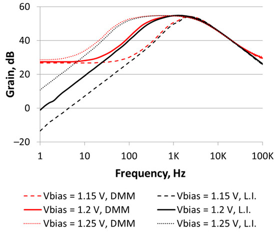 Frequency response of the amplifier BPF’s voltage gain, plot for three different VBIAS values: 1.15, 1.2 and 1.25 V. For each VBIAS, measurements are taken either with a digital multimeter (DMM) or with a lock-in amplifier (LIA).