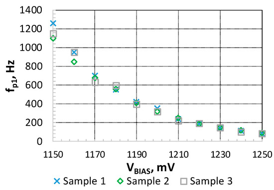 The effects of the manufacturing variability on R2 were also evaluated. Figure 7 shows the effect of R2 sample-to-sample variability on the measured fp1 values, as a function of VBIAS in three different IC samples. In all these situations, the maximum gain measured was 54.5 ± 0.43 dB, in agreement with the expected gain independence with VBIAS.