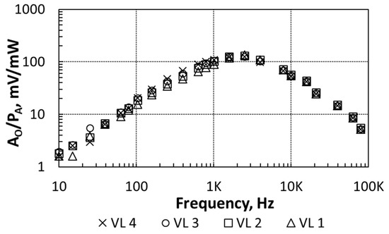 Sensor’s sensitivity as a function of the frequency. See Table 2 for the VL description and the PA values. Measurements taken with the LIA.