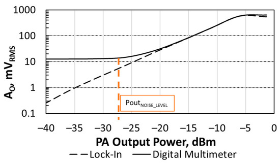 Figure 11 shows the sensor’s output voltage amplitude AO as a function of the total output power delivered by the PA to a 50 Ω load. The temperature transducer was biased with a current IB = 20 nA and the sensor’s filter with VBIAS = 1.2 V. The PA was driven with two tones with fRF = 420 MHz (its central frequency) and Δf = 1 kHz. Pi was swept to get a total output power delivered to the load ranging from −40 dBm to 0 dBm. This output power range was below the 1 dB compression point, ensuring constant PA gain for all the cases. The PA output power was measured with the Agilent E4443A spectrum analyzer. The sensor output voltage was measured with both the DMM in AC mode, and the LIA locked at Δf.