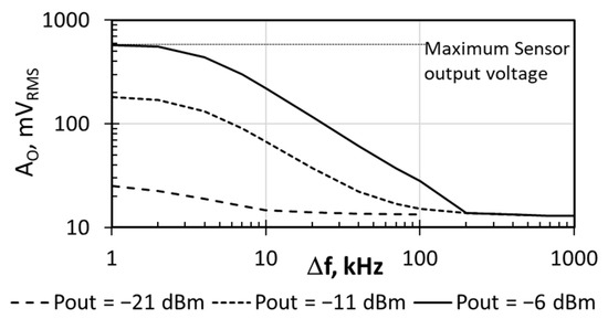 Several strategies can be followed to reduce the sensor sensitivity: (i) increasing the distance between the CUT and the temperature transducer T1 in the IC layout [40]; (ii) decreasing the BPF gain below the current Av = 500, which opens the possibility to implement BPF amplifiers with tunable gain for dynamic range extension and (iii) changing the transducer’s T1 dimensions or bias [43,44]. All these strategies require either a custom layout depending on the target measurements or the design of additional complex circuits, such as tunable gain networks or a programmable transducer bias. Nevertheless, there is another strategy that can be used without redesigning the sensor or the sensor placement. As pointed out by Figure 9 and discussed in Section 3, the sensor sensitivity can be reduced by choosing a Δf value higher than fc. To illustrate this sensitivity reduction, Figure 12 shows the AO,RMS measured with the DMM when increasing Δf above 1 kHz, for three constant PA output power values. Focusing on Pout = −6 dBm, with Δf = 1 kHz the sensor output had already reached the saturation level observed in Figure 11. As Δf was increased, the measured output amplitude decreased (i.e., the sensor enters in the linear range), thus enabling the possibility to monitor higher output powers. Finally, when Δf = 200 kHz, the DMM output reached the noise level, and Pout = −6 dBm became the PoutNOISE_LEVEL. From Figure 12, PoutNOISE_LEVEL was −21 dBm when Δf = 10 kHz, and −11 dBm when Δf = 100 kHz. Therefore, Δf selection allowed us to easily adjust the linear response of the sensor to different ranges of dissipated power.