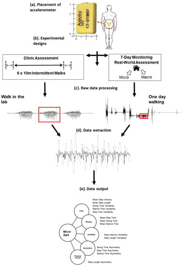 Illustration of gait protocol from initial body-worn monitor placement to data output, adapted from Mc Ardle [14]. (a) Example of body worn monitor placement for free-living data collection on L5 centrally located on the lower back; (b) gait protocols for lab and real-world assessment; (c) examples of lab and real-world accelerometer signals; (d) the raw vertical acceleration signal segmented into walking bouts; (e) conceptual model of gait representing domains and 14 gait characteristics. Figure adapted from Mc Ardle et al. (2018). The publication is available at IOS Press through DOI: 10.3233/JAD-171116.