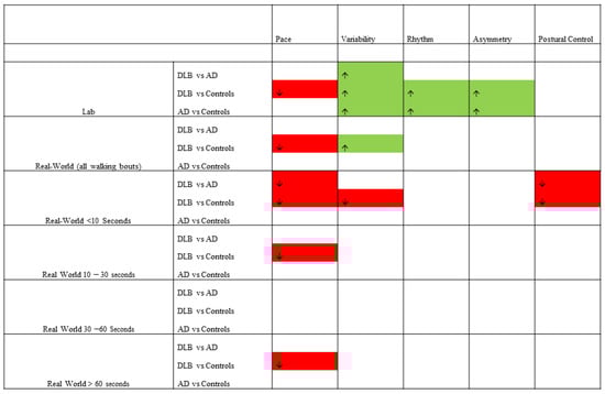 Gait impairments between groups across all conditions. Green = characteristic is significantly greater in the first group than the second. Red = characteristic is significantly less in the first group than the second.