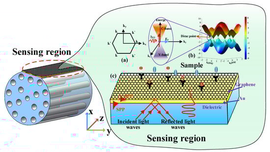 Surface plasmon resonance (SPR) sensing mechanism of D-type photonic crystal fiber (PCF) sensor. (a) The Brillouin zone of the graphene lattice. (b) Linear dispersion diagram of the band structure of single-layer graphene. (c) Schematic diagram of Graphene-Au sensing mechanism.